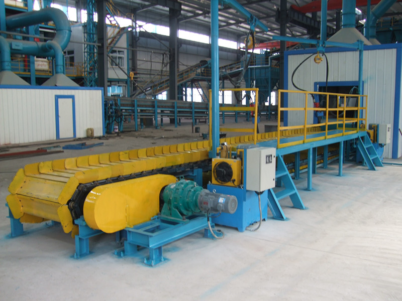 其结构特点是槽体由钢板冲压成带挡边的波浪形底板, 有足够的强度和刚度, 牵引链与槽体用螺栓连接, 自重轻。该产品已广泛用于铸造、建材、矿山、造纸等行业, 其中已使用的产品鳞板犬宽度为2400mm, 输送机大长度L=100m,爬升大高度为10m。